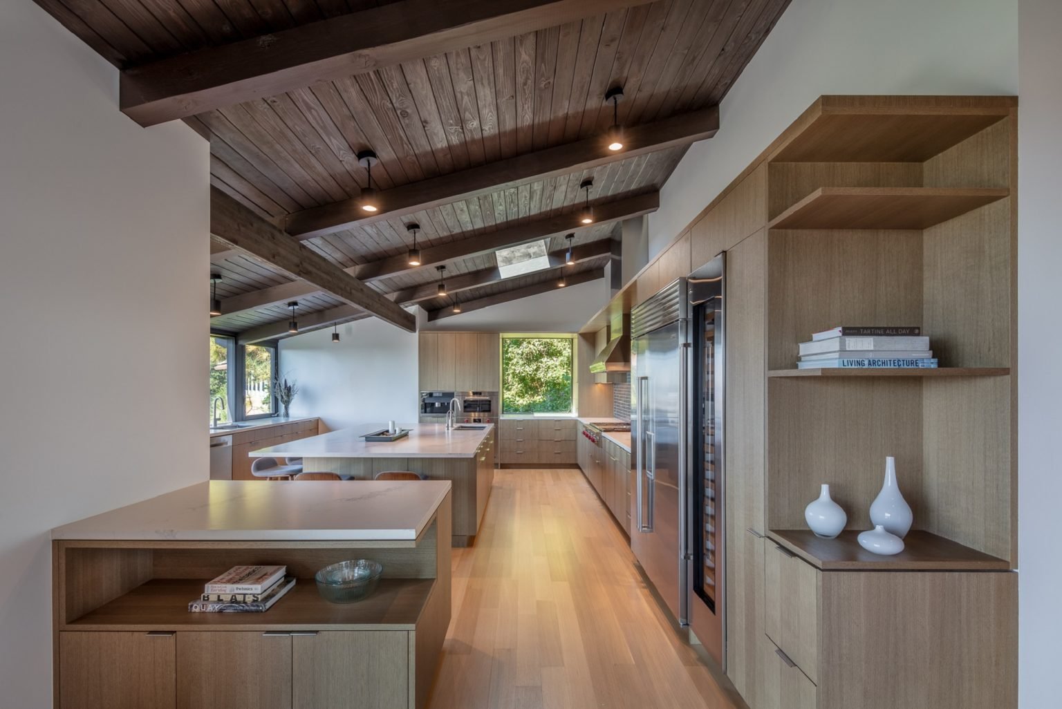The living room received attention with new high clerestory windows above a built-in fireplace, bookcase and entertainment cabinet in wood matching the kitchen. New Fleetwood sliding doors on either side give a see through experience from the street to the view side of the house. An existing stair opening was kept, but reversing the stair direction with a new open steel and wood staircase improved circulation dramatically.