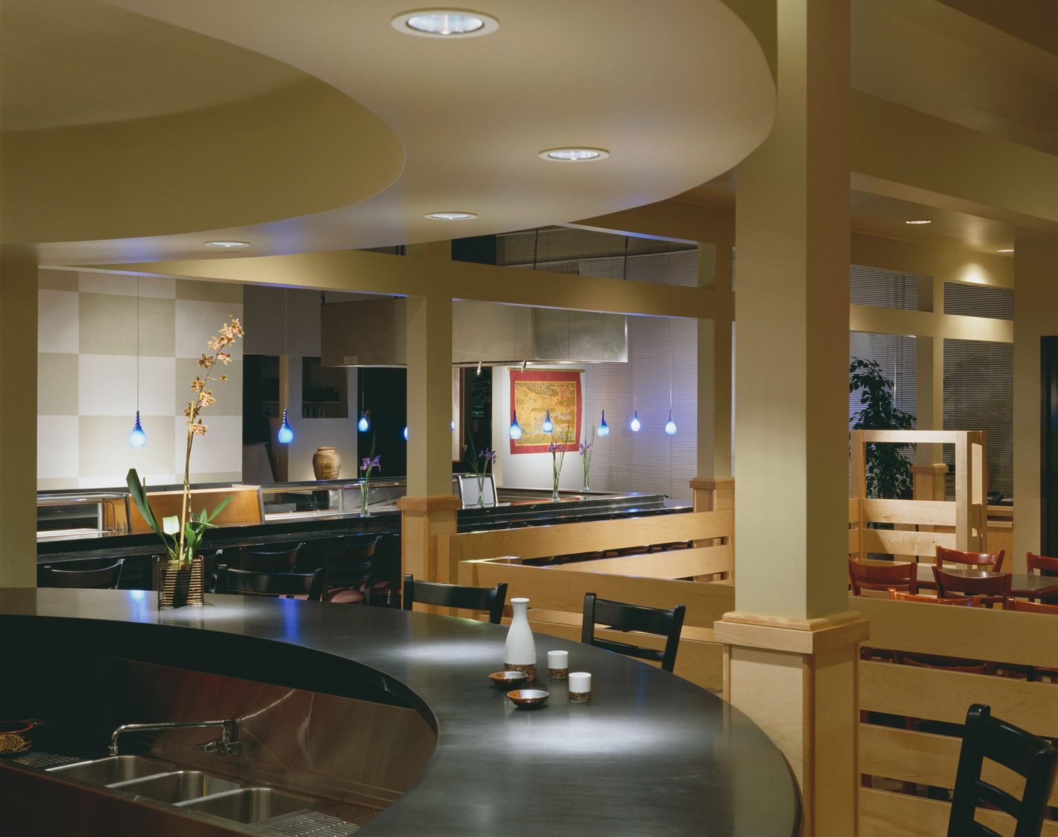 The project was to remodel the existing, already very successful restaurant in Berkeley. New colors and materials were introduced and low fences were designed to clarify circulation from seating areas. A new sake tasting bar was added as a circular element that pivots circulation behind from a waiting area and the restrooms. Extensive neighborhood meetings were held on Sundays to ensure participation to solicit opinions to control restaurant parking in adjacent residential neighborhoods.